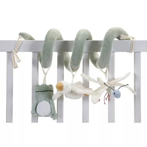 Een activiteitenspiraal Little Goose van het Nederlandse merk Little Dutch. Aan de activiteitenspiraal hangen drie knuffeltjes, een kikker, gans en libelle. De knuffeltjes hebben een rammelaar, spiegeltje of knisper.