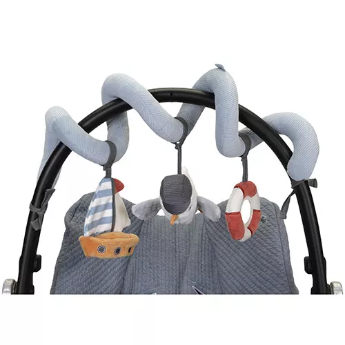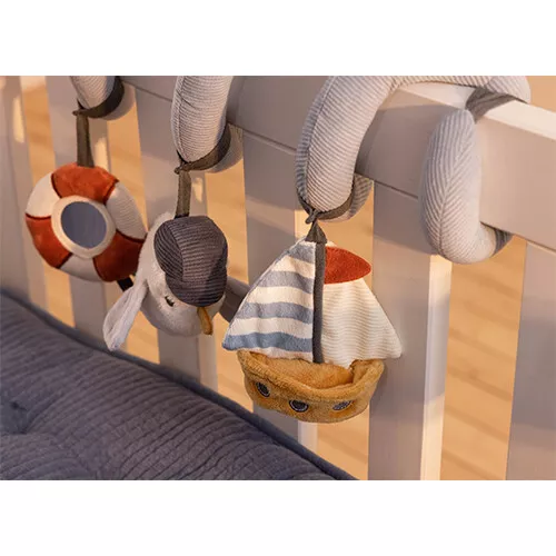 Baby’s vermaken zich thuis en onderweg met deze activiteitenspiraal ‘Sailors Bay’ van het Nederlandse merk Little Dutch. Aan de boxspiraal hangen drie activiteitenknuffeltjes met een rammelaar, spiegeltje of knisper.