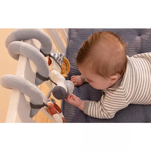 De knuffeltjes zijn bevestigd aan een uitrekbare spiraal die aan de box, kinderwagen, Maxi-Cosi of babygym bevestigd kan worden.