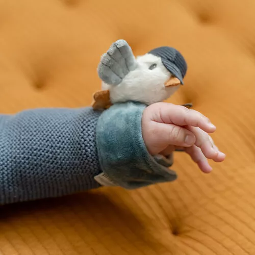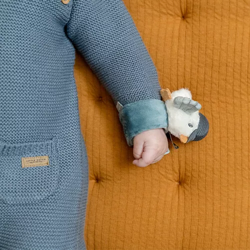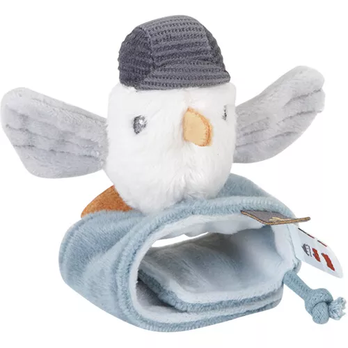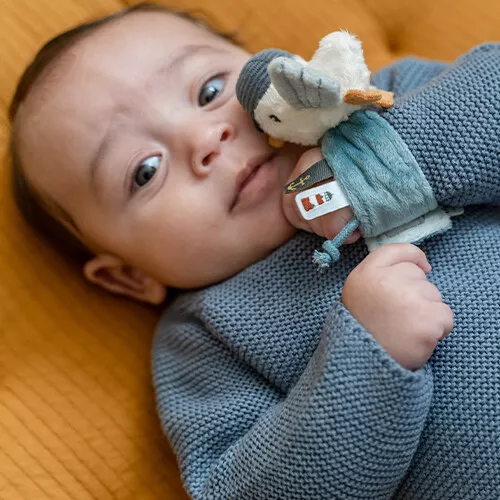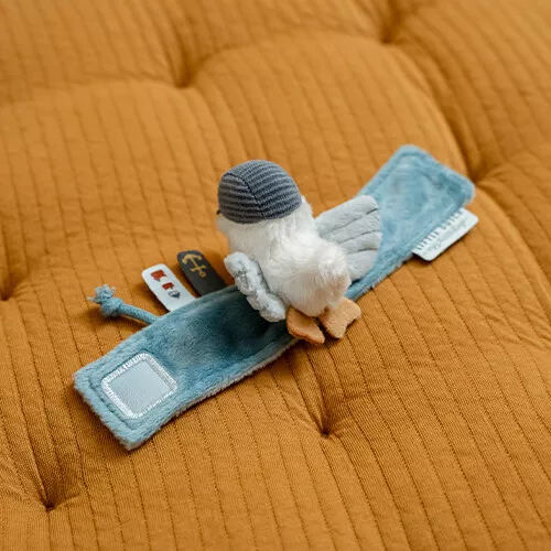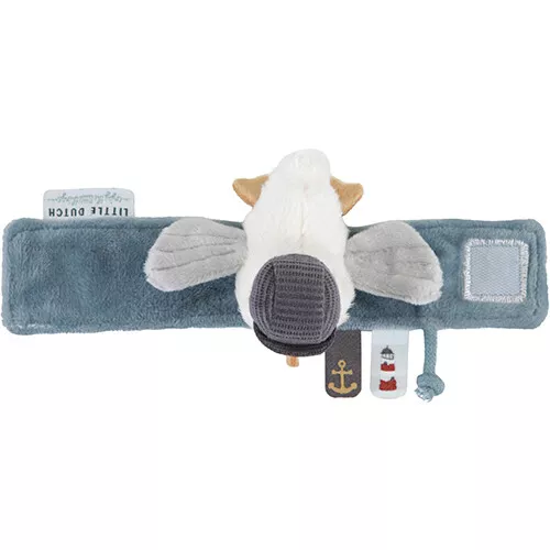 Een onweerstaanbare armband en rammelaar in één uit de ‘Sailors Bay’ collectie van het Nederlandse merk Little Dutch. De armbandrammelaar met een kleine knuffelmeeuw heeft knisperend materiaal en een rammeltje. Met een klittenbandsluiting kan het babyspeelgoed om de pols bevestigd worden.