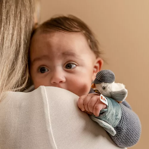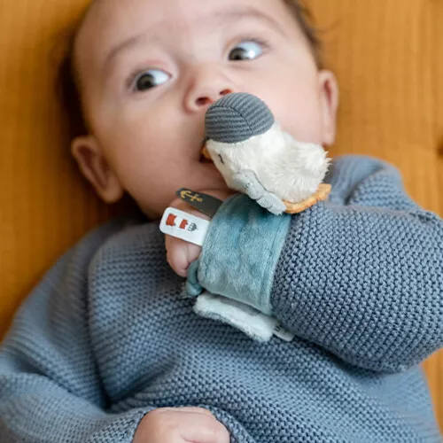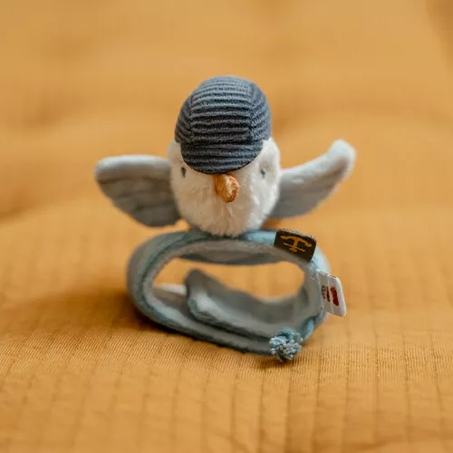 Zodra de zeemeeuw om je arm zit, wijkt hij niet meer van je zijde. Zo kunnen de allerkleinsten, die nog niet zo goed kunnen grijpen, toch een rammelend vriendje dichtbij zich hebben.