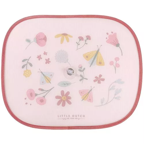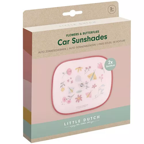 De twee auto zonneschermen ‘Flowers & Butterflies’ van het Nederlandse merk Little Dutch, beschermen kinderen op de achterbank tegen zonlicht en UV-straling. Ook houden ze een deel van de warmte buiten.