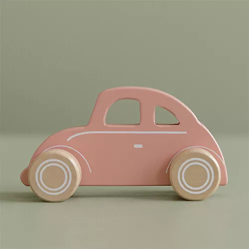 Laat deze roze houten speelgoedauto van het Nederlandse merk Little Dutch vrolijk door de kamer rollen.