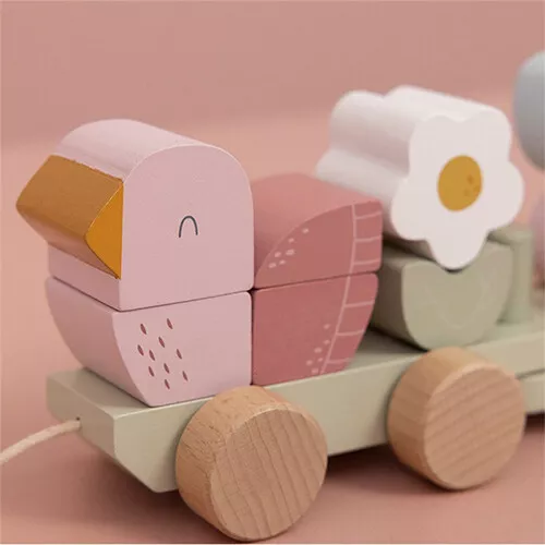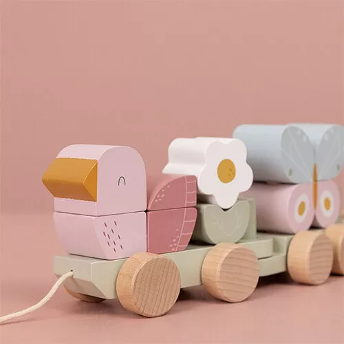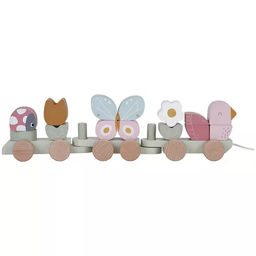 Stapelen en rijden maar met deze houten blokkentrein ‘Flowers & Butterflies’ van het Nederlandse merk Little Dutch.