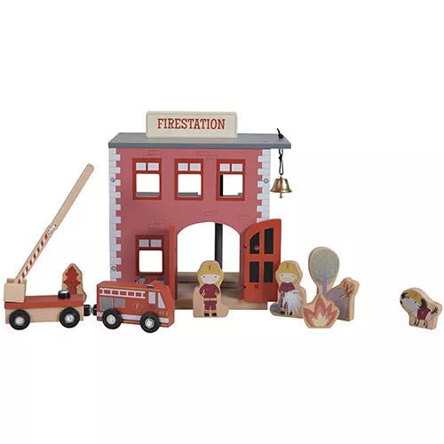 De 12-delige speelgoedset wordt geleverd met een brandweerwagen met uitvouwbare ladder, een boom waaruit een poes gered moet worden, brandjes om te blussen en zelfs een hond die de brandweerlieden assisteert. De houten figuren hebben aan beide kanten een gedetailleerde illustratie.