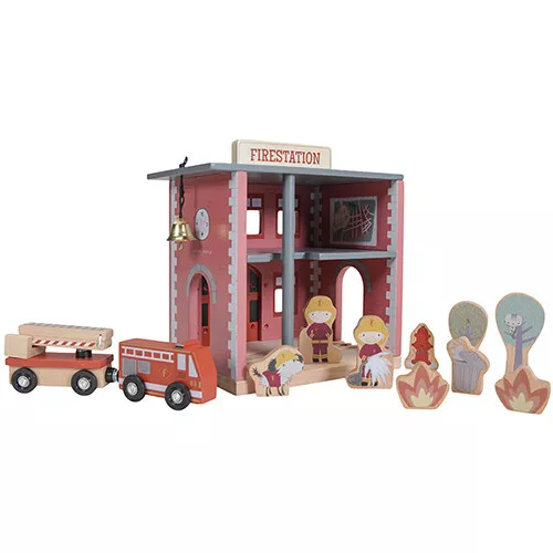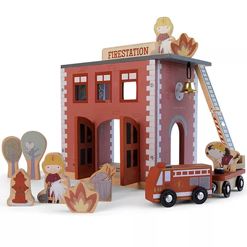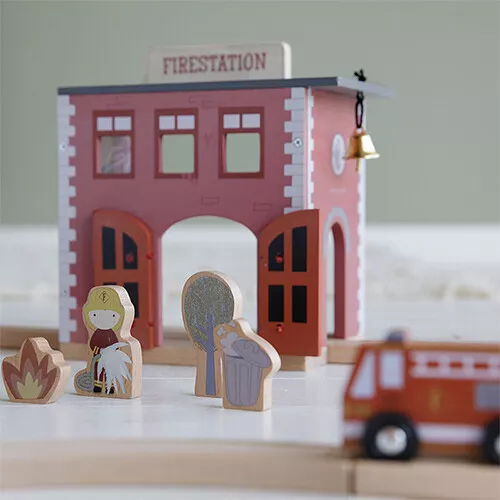 In deze houten brandweerkazerne uit de Little Railway Collection van het Nederlandse merk Little Dutch staat de brandweer klaar om vliegensvlug hulp te bieden waar het nodig is.