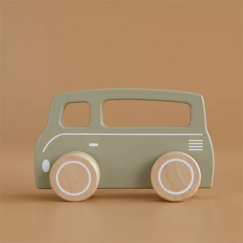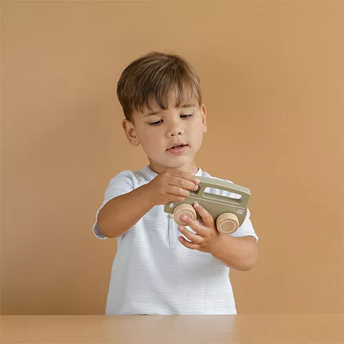 Laat deze olijfkleurige houten speelgoedbus van het Nederlandse merk Little Dutch vrolijk door de kamer rollen.