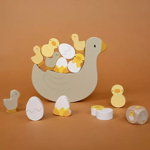 Met hoeveel kuikens en eieren kan Little Goose balanceren? Een massief houten ‘Balansspel Little Goose’ om samen of alleen te spelen van het Nederlandse merk Little Dutch. Hopelijk vallen er geen kuikens.