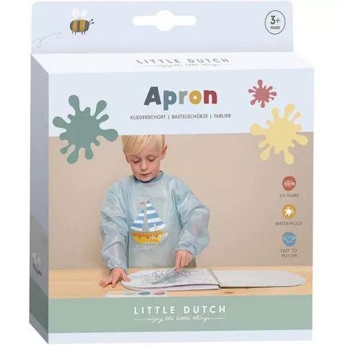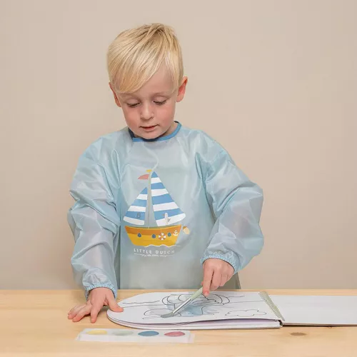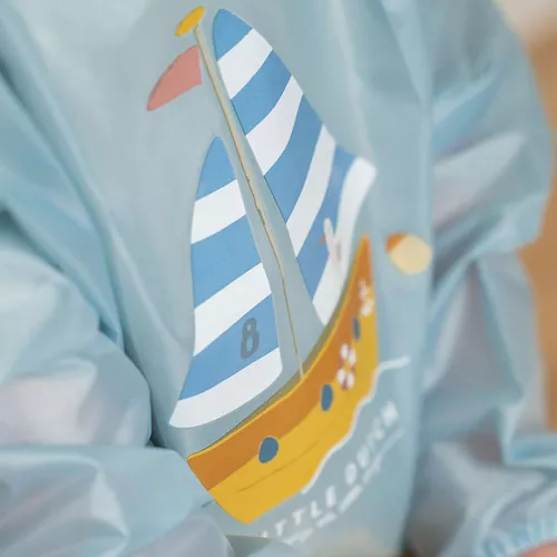 Verven, kleuren of plakken of aan tafel met eten? Kliederen is geen probleem met dit waterbestendige kinderschort uit de Sailors Bay collectie van het Nederlandse merk Little Dutch. Het kliederschort houdt de kleertjes netjes schoon!