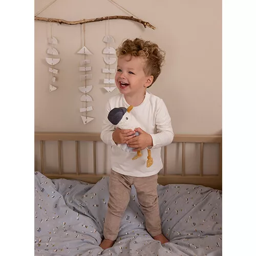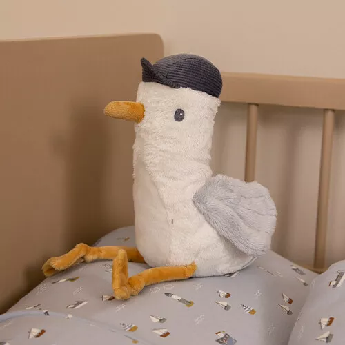 Jack de zeemeeuw uit de ‘Sailors Bay’ collectie van het Nederlandse merk Little Dutch is hier om te knuffelen! Deze komische meeuw draagt een stoere, corduroy pet en heeft geborduurde oogjes. Hij is makkelijk vast te pakken aan zijn lange pootjes en flapperende vleugels.