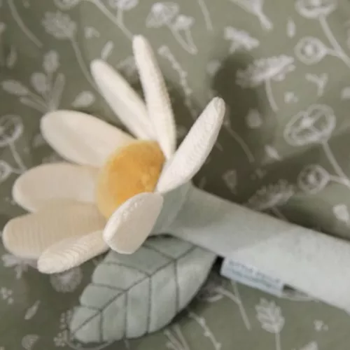 Een knuffelbloem met rammelaar uit de collectie ‘Little Goose’ van het Nederlandse merk Little Dutch.
