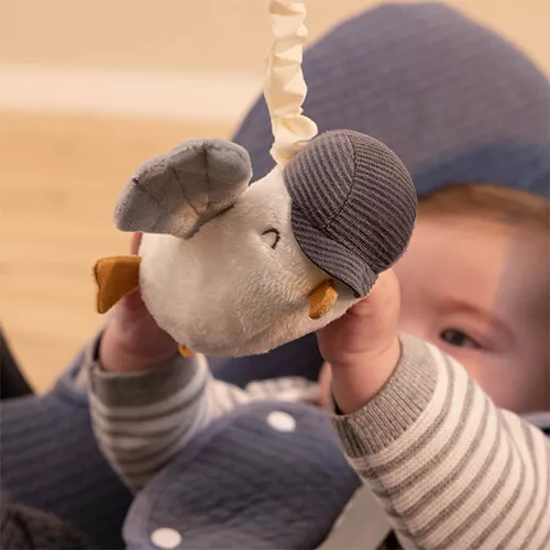 Deze kleine knuffelmeeuw uit de collectie ‘Sailors Bay’ van het Nederlandse merk Little Dutch krijgt de allerkleinsten aan het lachen. Als de baby de komische zeemeeuw met zijn corduroy pet vastgrijpt en naar zich toe trekt, begint hij te trillen!