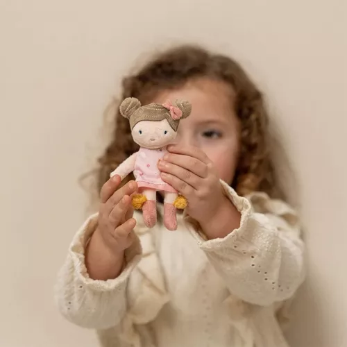 Een fluweelzacht lappenpopje ‘Rosa – 10 cm’ van het Nederlandse merk Little Dutch voor de allerkleinsten. Het charmante knuffelpopje heeft een geborduurd gezichtje, knotjes in het haar en draagt een lichtroze jurkje met fleurig dessin.