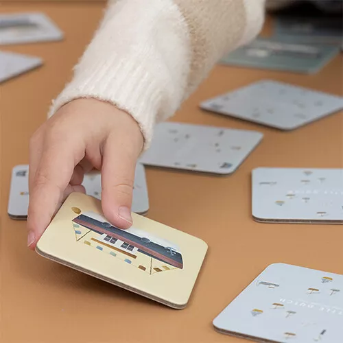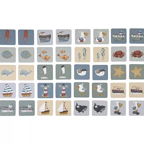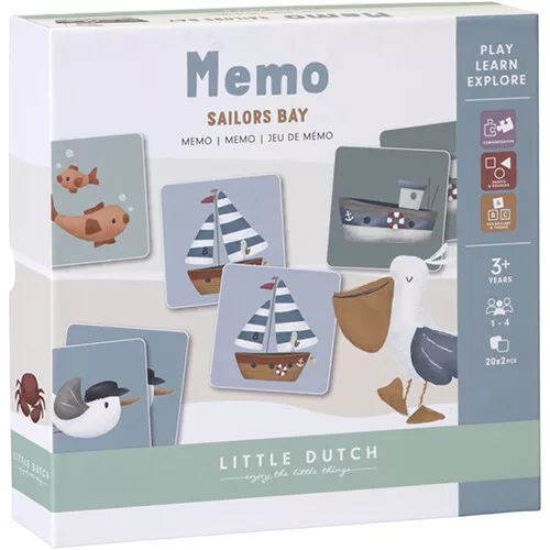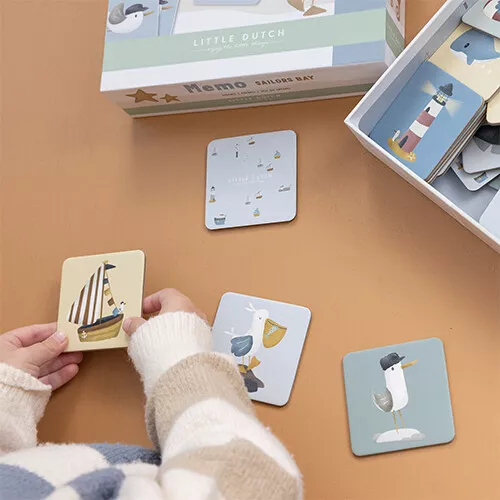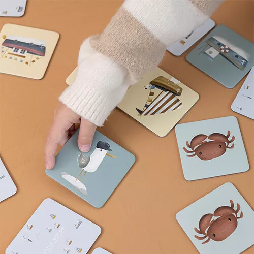 Een memoriespel ‘Memo Sailor Bay’ van het Nederlandse merk Little Dutch met 20 verschillende illustraties van zeedieren, boten en strandvrienden in zachte pasteltinten.