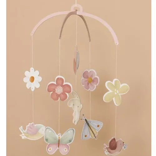 Een mobiel ‘Flowers & Butterflies’ van het Nederlandse merk Little Dutch met allerlei bloemen en lieflijke vlinders, vogeltjes en een konijntje.