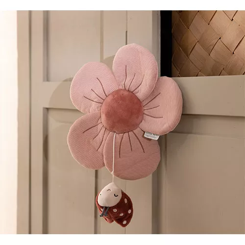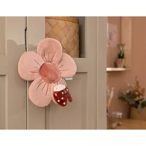 De pluche bloem met het lieveheersbeestje kan met een lus aan het kinderbedje of aan de box opgehangen worden.