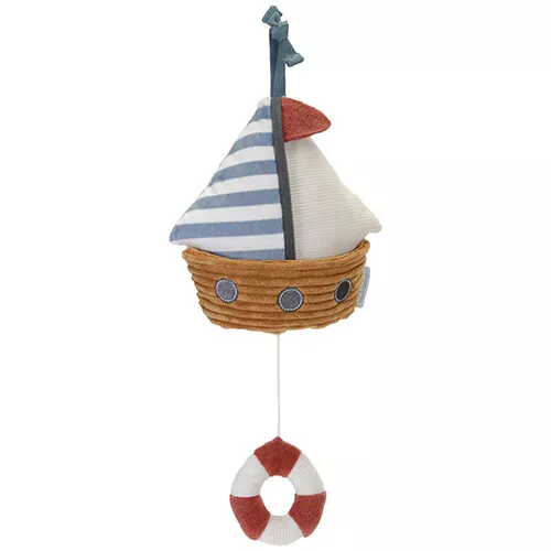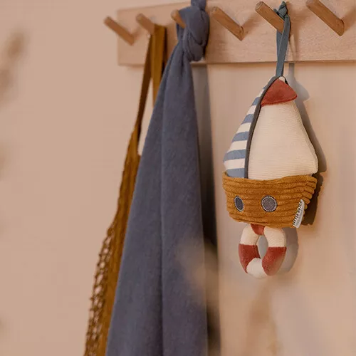 Baby’s dromen heerlijk weg bij het zachte, rustgevende melodietje ‘Sweet Lullaby’. Bevestig dit zachte zeilbootje uit de collectie ‘Sailors Bay’ van het Nederlandse merk Little Dutch aan de wieg of het ledikant. Trek aan de reddingsboei en het muziekdoosje doet zijn werk.