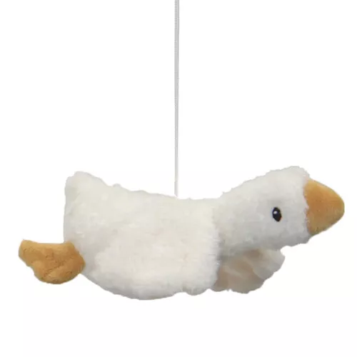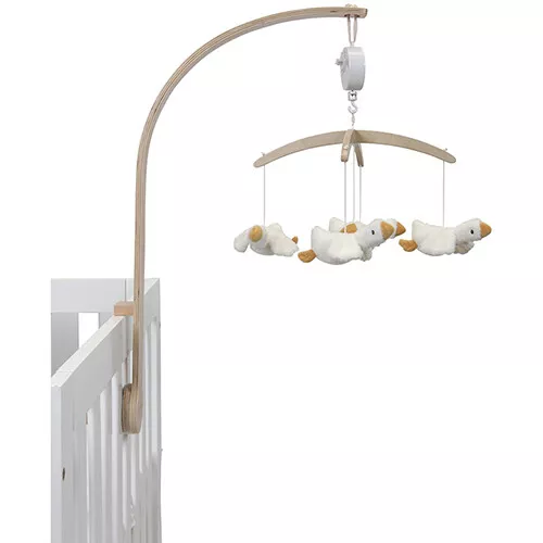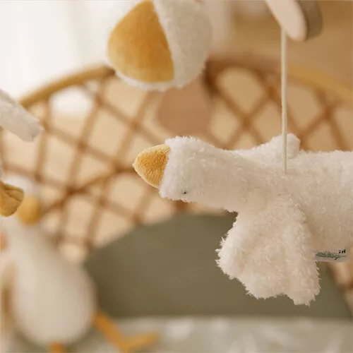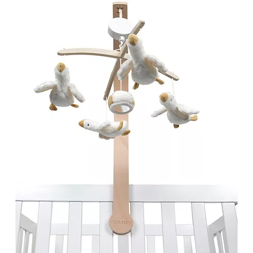 Een muziekmobiel met houder ‘Little Goose’ van het Nederlandse merk Little Dutch met vriendelijke gansjes en een rustgevend slaapliedje ‘Over the Rainbow’.