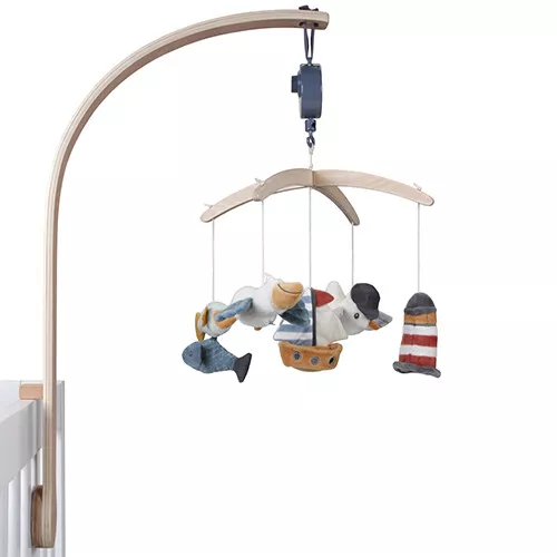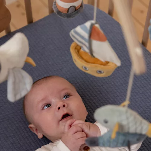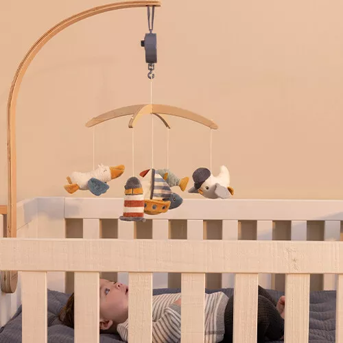De beweging van de speeltjes is interessant voor baby’s om naar te kijken en stimuleert zo de visuele ontwikkeling. In combinatie met het liedje ‘Somewhere over the rainbow’ kan de baby hier heerlijk bij wegdromen.