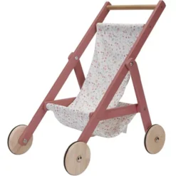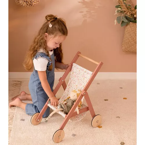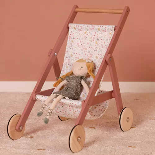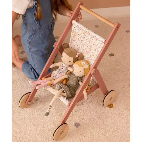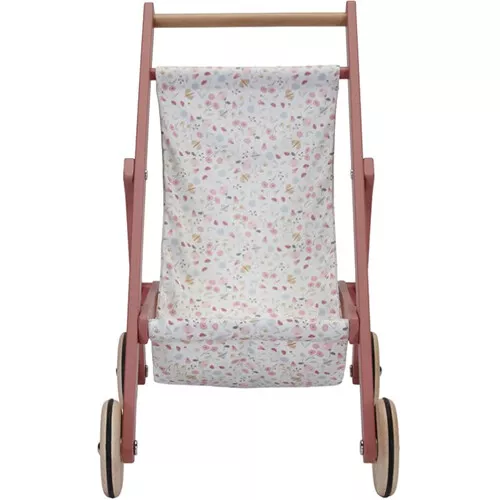 Poppen en knuffels kunnen gezellig mee op stap in deze houten poppenwagen met ‘Flowers & Butterflies’ dessin van het Nederlandse merk Little Dutch.
