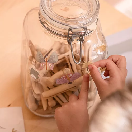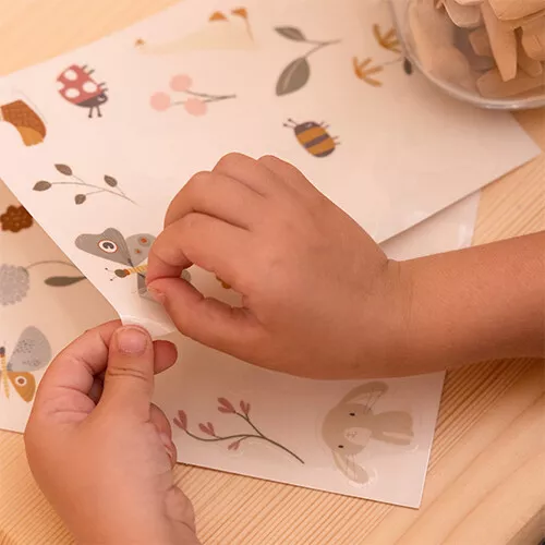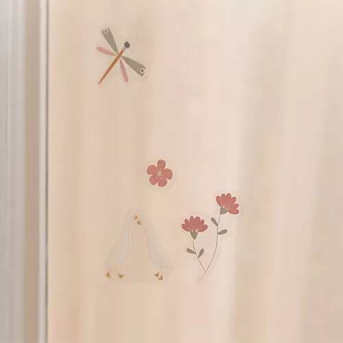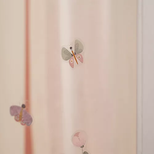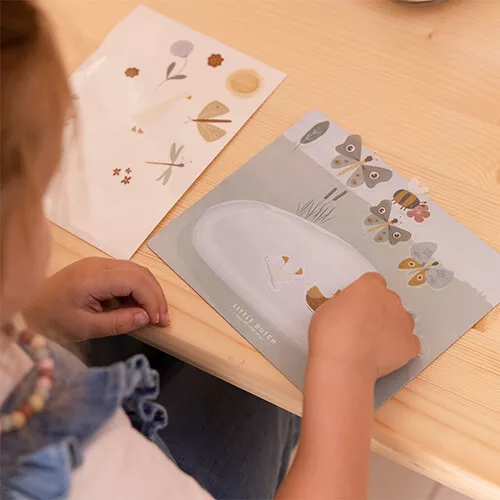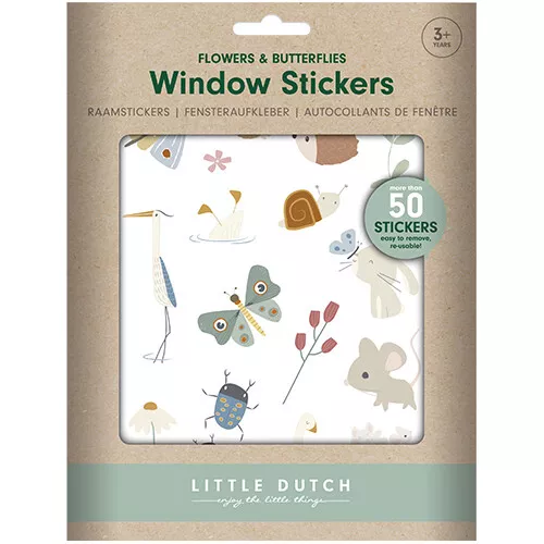 Snoezige, pastelkleurige raamstickers ‘Flowers & Butterflies’ van het Nederlandse merk Little Dutch van insecten, bloemen en diertjes. Plak kleine verhaaltjes op het slaapkamerraam, het autoraam of op de bijgeleverde achtergrond.