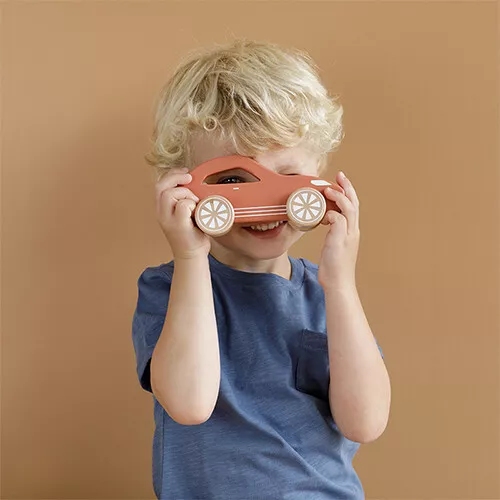 Laat deze roestbruine houten speelgoedauto van het Nederlandse merk Little Dutch vliegensvlug door de kamer racen.