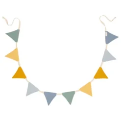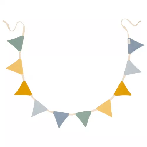 De stoffen slinger heeft vlaggen in de zachte kleuren lichtblauw, blauw, geel, oker en groen.