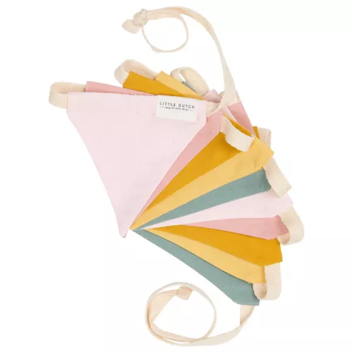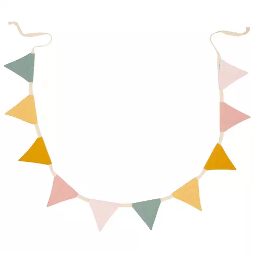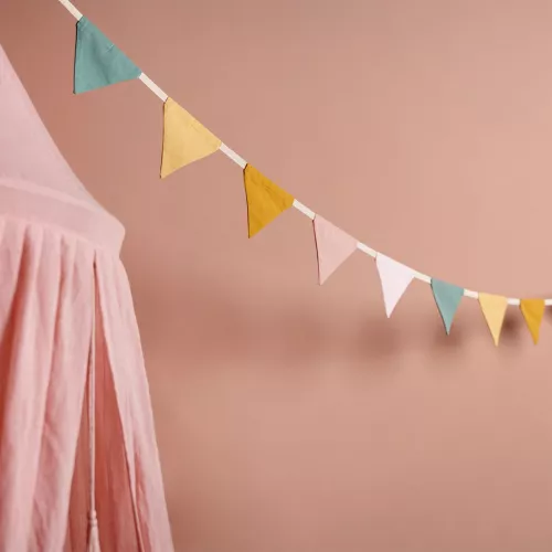 De stoffen slinger heeft vlaggen in de zachte kleuren lichtroze, roze, geel, oker en groen.