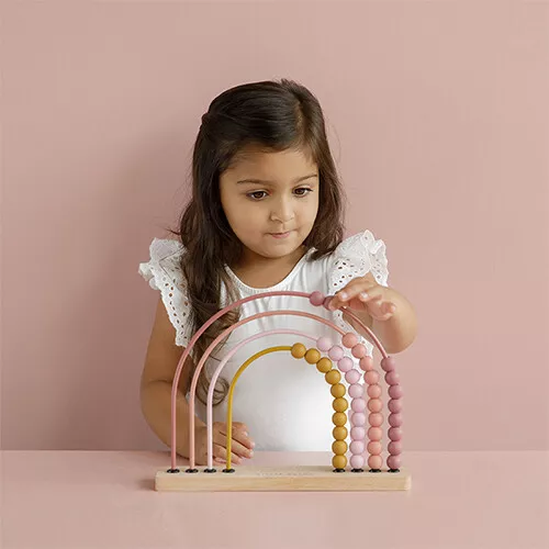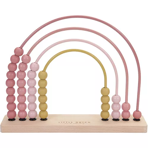 Klassiek speelgoed in een nieuw jasje. Dit telraam ‘Regenboog – Pink’ van het Nederlandse merk Little Dutch heeft vier gekleurde bogen in de vorm van een regenboog. Elke boog heeft tien kralen, hoe de kralen ook verdeeld worden.