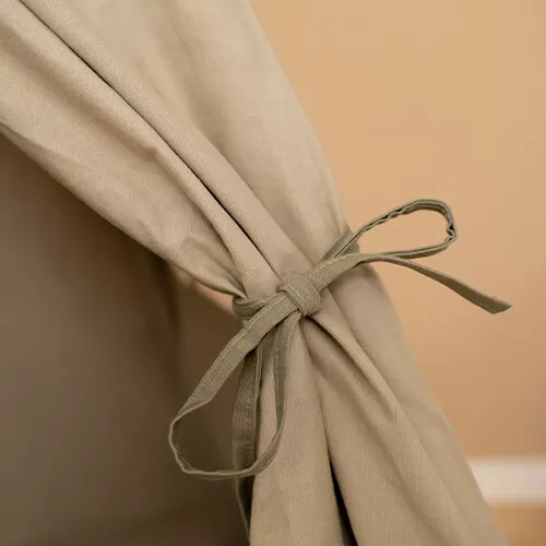 De speeltent heeft een raampje met een gordijntje dat opgerold en vastgeknoopt kan worden. Ook de flappen voor de opening kan met linten worden vastgeknoopt.