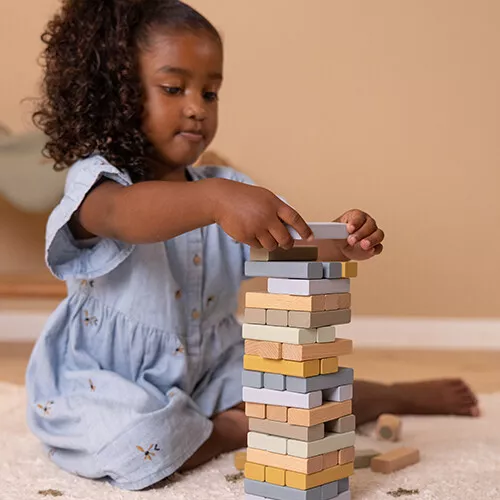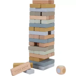 Hoe ver kan je gaan met het weghalen van de blokjes alvorens de toren omvalt, of bouw een hoge toren. Een stapelblokkenspel van het Nederlandse merk Little Dutch, waarmee alleen of samen met anderen gespeeld kan worden.
