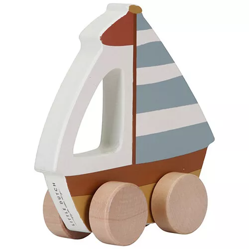 Laat deze houten speelgoedboot van het Nederlandse merk Little Dutch vrolijk door de kamer rollen.